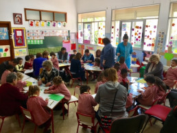 El jueves, 6 de Abril, han regresado a las aulas de infantil -por segunda vez este curso- algunos de nuestros seres más queridos: abuelas/os, tatas, yayas,"abus", padrines, predines, "titas", "titos", vecinas que hacen de abuelas, etc... Son personas que comparten gran parte de su tiempo y su cariño con los más pequeños de la escuela. Por ese motivo, cada trimestre nos visitan para realizar una actividad con sus nietos y sobrinos/as. Siempre es una alegría tenerlos en nuestras clases. Su presencia es todo un regalo para nuestros alumnos/as. En esta ocasión, la manualidad a desarrollar estaba muy relacionada con la primavera. Consistía en la confección de un ramo compuesto por tres flores, hechas a base de: palos de polo, goma-eva brillante y lisa de varios colores, además de una base de plastilina. Las abuelas se han metido de lleno en la propuesta: han copiado los modelos en la goma-eva; han recortado y pegado, mientras los alumnos coloreaban el palo de madera que hacía las veces de tallo de la flor. En ocasiones, los mayores se han visto sorprendidos por las habilidades y la ayuda de los pequeños. La actividad ha supuesto un verdadero trabajo en equipo. Juntos, hemos compartido materiales, formas de hacer y momentos que, a buen seguro, quedarán grabados en nuestra memoria. Ha sido una experiencia enriquecedora, en la que hemos podido observar la comunicación y coordinación en la tarea de los más pequeños con los más mayores y viceversa. La visita se ha desarrollado en el horario de tarde. Así que después de la tarea, grandes y pequeños han compartido juegos y momentos de gran complicidad en el patio de la escuela. Todos los alumnos -incluso los que no han contado con la presencia de un familiar- se han sentido arropados por los familiares de sus compañeros/as y también han recibido la ayuda de las maestras. Todos se han sentido acompañados y el equipo docente, realmente encantados con la presencia de nuestros mayores.